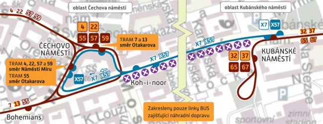 Tramvaje dočasně nahradí autobusový spoj. Rekonstrukce se týká úseku Čechovo náměstí / Bohemians – Koh-i-noor – Kubánské náměstí od 27. 2. (0.30 hod.) do 12. 4. (0.30 hod.). Dopravní podnik dokončí rekonstrukci tramvajové trati ve Vršovické ulici, proběhne též rekonstrukce části vjezdu do tramvajové smyčky Kubánské náměstí a oprava části tramvajové křižovatky Koh-i-noor. Náhradní autobusová doprava jako X7: Čechovo náměstí (průjezdní) – Čechovo náměstí (T) – Koh-i-noor – Slavia – Kubánské náměstí (v denním provozu), a jako X55: Čechovo náměstí (v Minské ulici) – Čechovo náměstí (T) – Koh-i-noor – Slavia – Kubánské náměstí (v nočním provozu). Budou i změny tramvajových zastávek – po dobu výluky se ruší zastávky Koh-i-noor, Slavia a Kubánské náměstí (ve směru od Koh-i-nooru); zastávky Nádraží Hostivař na střední koleji tramvajové smyčky (výstupní a nástupní) nebudou v nočním provozu obsluhovány. Zastávky Čechovo náměstí (v Minské ulici) a Kubánské náměstí (nástupní) budou obsluhovány i v nočním provozu.